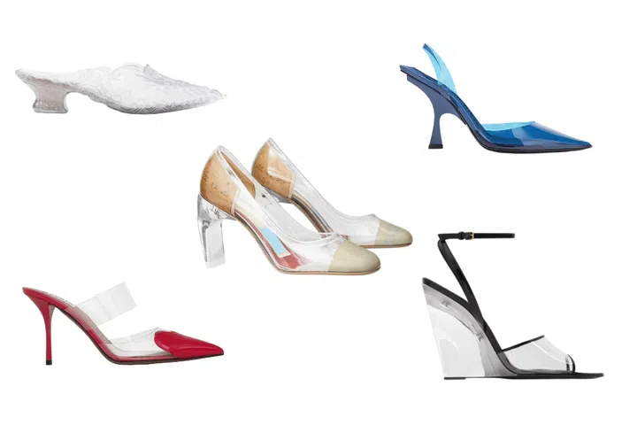 Get ready for your Cinderella moment with see-through steppers that also give the illusion of limbs for days. Victoria Beckham went for a full glass slipper, transparent number; while Gucci kept its transparency to the wedge and elongated toe for a lengthening effect. For a comfier take, try the Dries Van Noten mesh version with clear wedges.