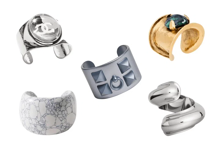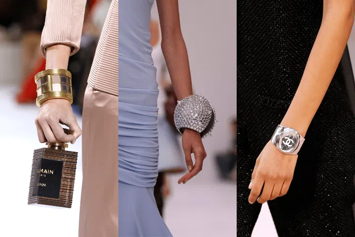 It’s time to swap your shimmery tennis bracelets and dainty companions with chunky cuffs. Worn with a slinky powder blue dress at Acne Studios, double cuffed at Chanel with almost every look, and commanding attention at Balmain—statement cuffs are the only wrist party you need this season.