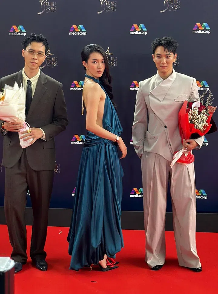 Zoe Tay kept things refined with a black dress punctuated by vibrant pink ruffles and a thigh-high slit. While it may feel more pared-back compared to her past appearances, the look still carried her signature elegance.