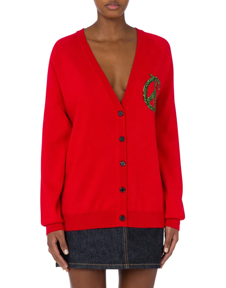Drawing inspiration from a painting created by Franco Moschino in the late 80’s where a stuffed 3D snake framed the picture, an apt adaptation by Creative director Adrian Appiolaza, features reimagined iconic symbols such as the peace motif and question mark.