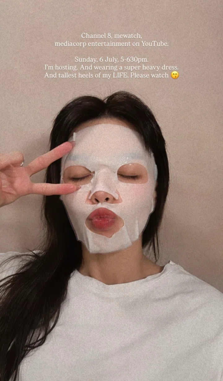 Taking matters into her own hands, the newly engaged radio jock and Star Awards Walk of Fame host made sure her skin was red-carpet ready ahead of the big night. In the lead-up, she prepped with an at-home mask, an essential for “hosting, wearing the heaviest dress, and the tallest heels of my life.”