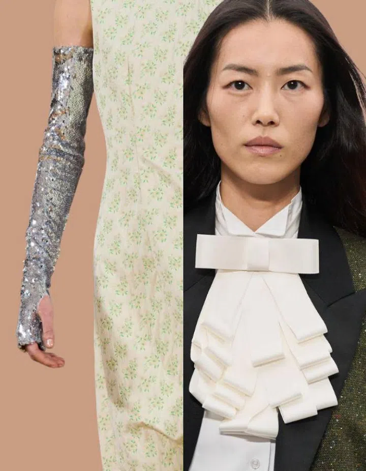 Bows were the season’s defining decorative detail, most notably at Dior, where it appeared across bags, shoes, accessories, and jewellery. Moschino translated the motif onto belts, while Simone Rocha offered delicate bow brooches. Every discerning woman this season also needs a statement pair of gloves — from sheer designs at Mugler and elongated styles at Gucci to sleek leather pairs at Prada — proving this practical accessory can be both functional and fashion-forward.