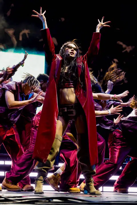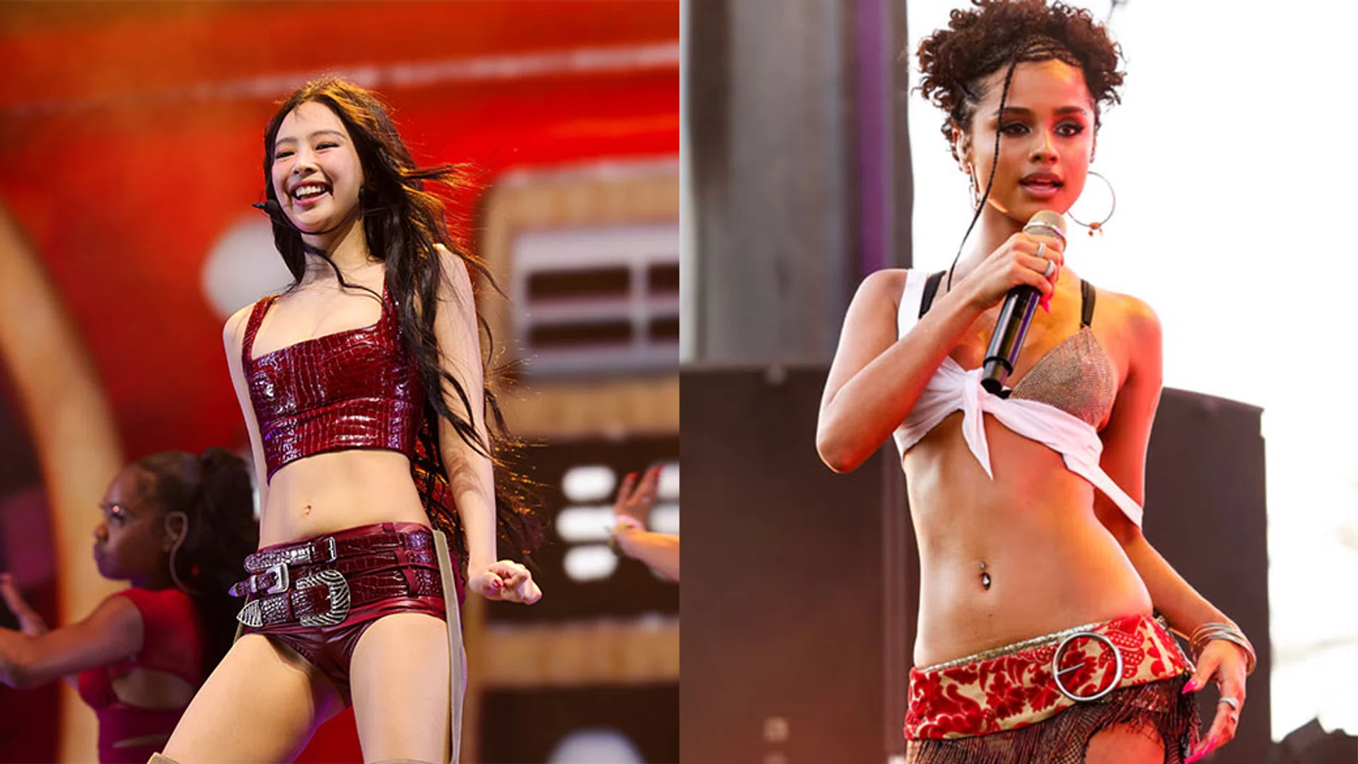 We wanna rock with Jennie! Jennie returned to the Coachella stage with a powerful performance of her debut solo album, Ruby. Dressed in fiery red, Jennie sizzled in a cowboy chic-esque ensemble consisting of a leather two-piece set with a tube top, mini shorts adorned with multiple belts and suede camel-coloured boots. Jennie performed hits like “ExtraL”, “Like JENNIE” and the crowd went wild when she brought out featuring artist Kali Uchis for “Damn Right”.