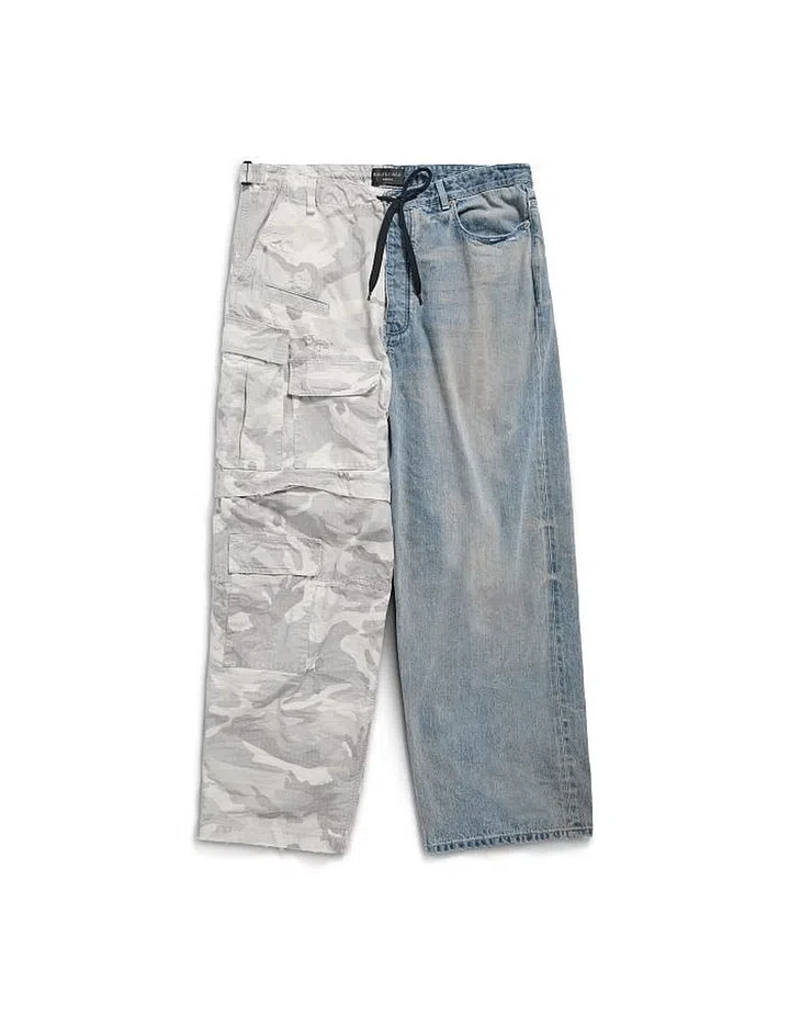 Demna’s Balenciaga defies convention once again. This pair of baggy pants merges a light grey cotton camo print with light blue organic selvedge denim for a truly distinctive look.