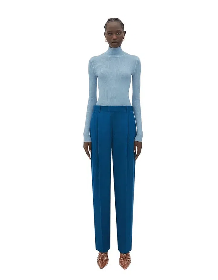 Matthieu Blazy’s Bottega Veneta appears to have effortlessly mastered the art of elegant womenswear tailoring this S/S ’24, with these refined wide-leg pants in pacific blue serving as a prime example.