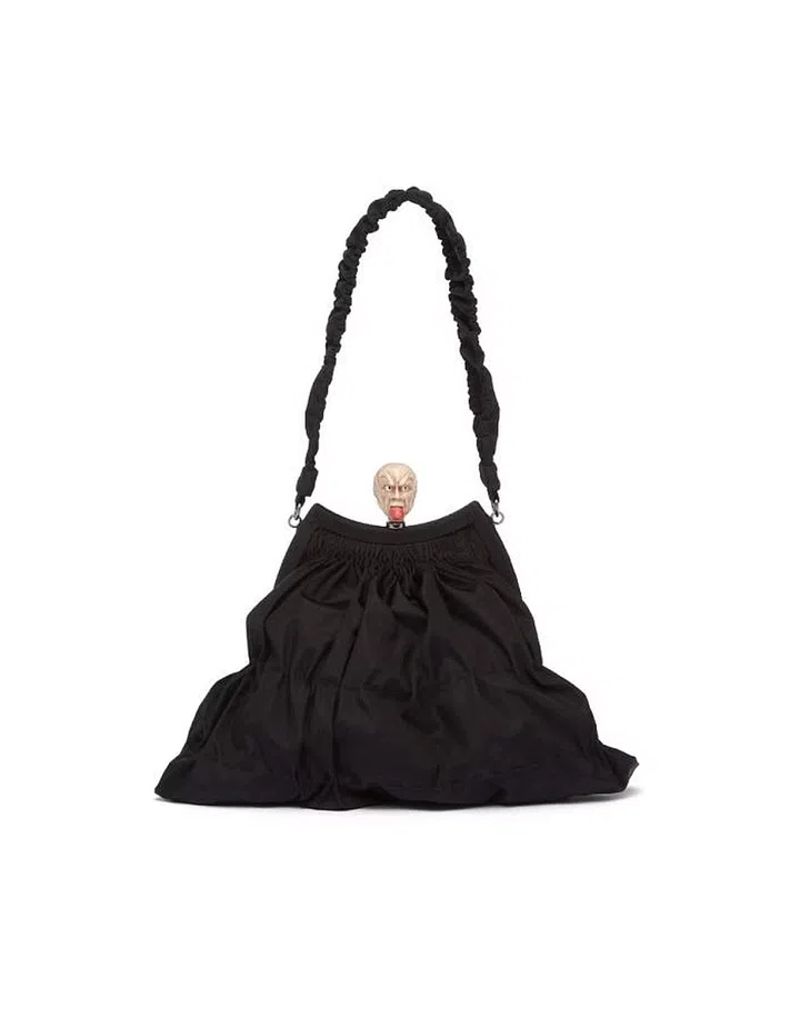One standout piece from Prada’s Spring/Summer 2024 collection is a black frame bag that refuses to settle for ordinary clasps. Instead, it features the intricately hand-carved head of a mythological figure, drawing inspiration from a design dating back to around 1913. While the bag appears to crinkle like paper, it’s actually crafted from a blend of nappa leather and Re-Nylon fabric, meticulously replicating the silk moire texture of its predecessor.