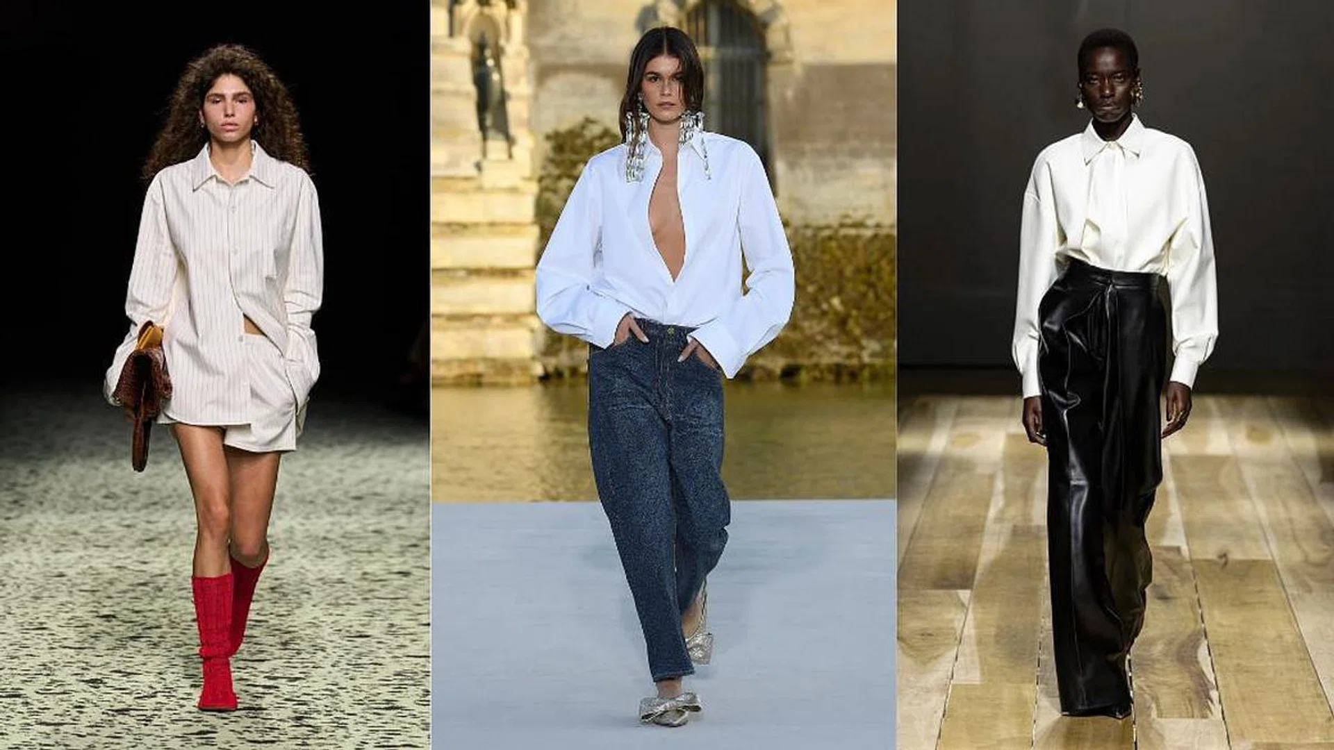 Elsewhere, Alexander McQueen leaned into Savile Row tailoring with a white dress shirt and leather wide-legged trousers combo. For the evening, Versace brought a spin to the house’s signature femme fatale look via a white shirt, jeans and leather gloves.