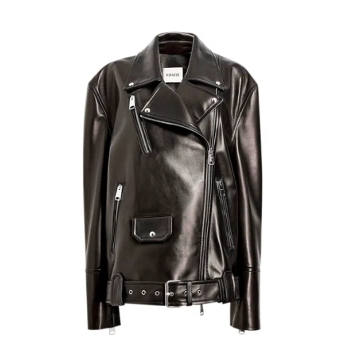 “Luxe outerwear like Saint Laurent’s and Hermes’ funnel-neck pieces bring rebellious, ’80s-’90s nostalgia with moody glamour. The oversized leather jacket is a key investment. Add edge over a silk slip or keep it cool with baggy jeans and loafers for a laid- back style.”