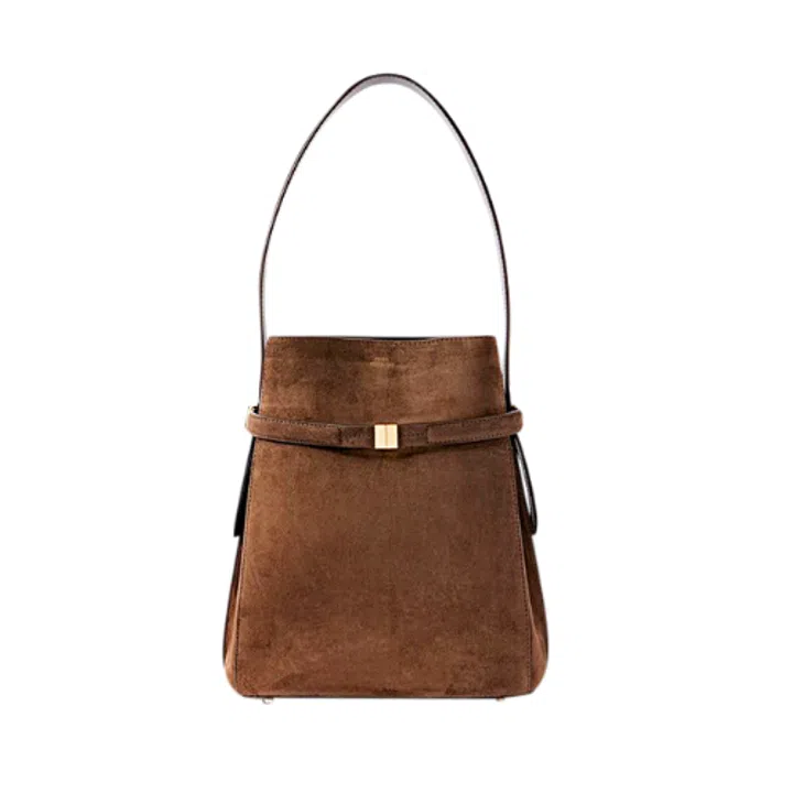 “Brown is everywhere this season, but when it comes to bags, it’s brown suede that’s stealing the spotlight. Luxury labels like Saint Laurent, Prada, Khaite, and Coach are all embracing the soft, textured finish in their latest collections. Smaller, independent brands are also delivering standout suede styles. Case in point: this gorgeous piece from Toteme.”