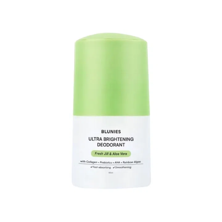 Take your “everything shower” routine up a notch with the Blunies Ultra Brightening Deodorant in Fresh Jill & Aloe Vera. Formulated with rainbow algae, probiotics, hyaluronic acid, and AHAs, it smooths and brightens underarm skin while keeping you fresh all day with a sweet floral scent of juicy pear.