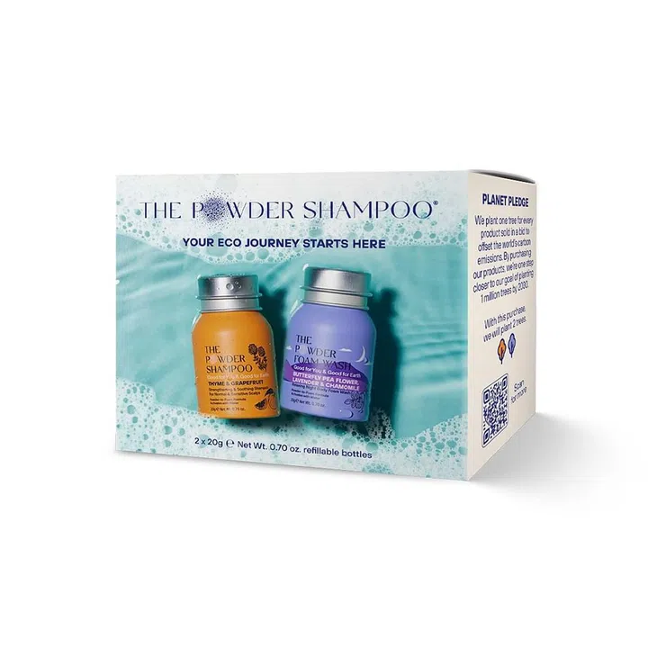 Cut back on water wastage with this powder shampoo and body wash bundle. Truly the gift that keeps on giving: With each purchase of the set, The Powder Shampoo will plant two trees.