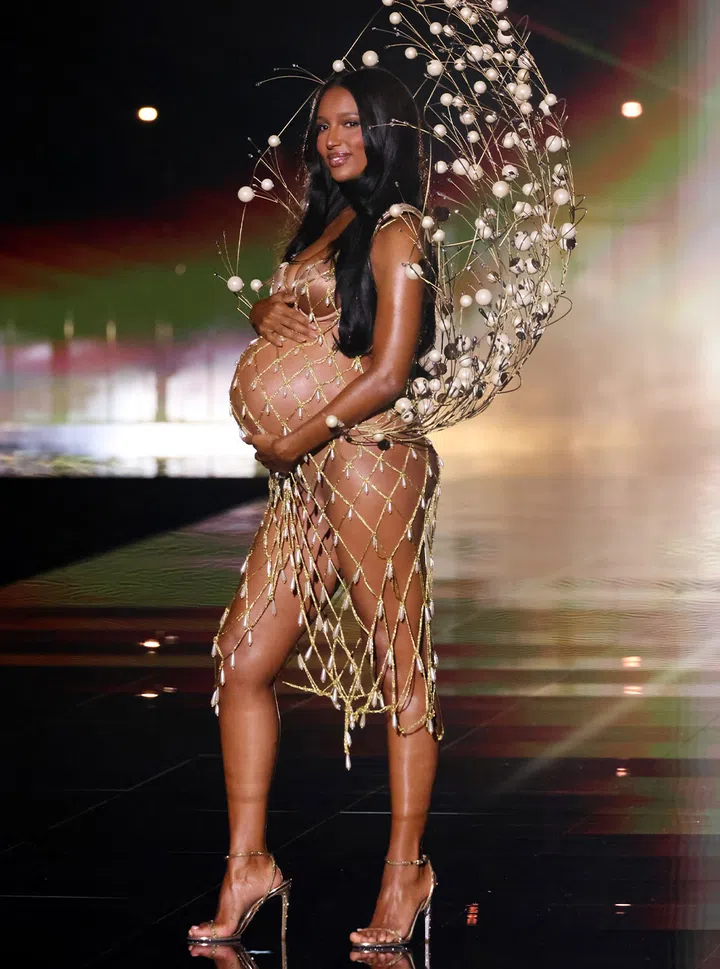 Californian-born model Jasmine Tookes made a powerful return to the runway. This time for two. Nine months pregnant, she opened the show glowing in a gold fishnet dress that highlighted her baby bump. At the end of the runway, she paused to cradle her stomach, radiating confidence, beauty, and pure maternal energy.