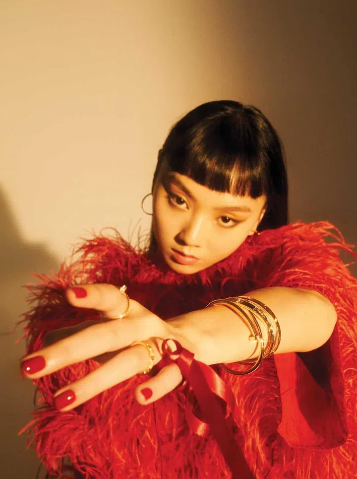 From left: Juste un Clou ring and bracelet with and without diamonds; LOVE ring, earrings and bracelets with and without diamonds all in gold, Cartier. Feather and silk dress, Givenchy