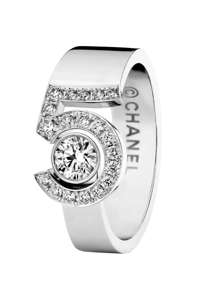 The French maison also pays tribute to Mademoiselle Chanel’s favourite number: five. Her star sign Leo is the fifth sign of the zodiac, and she famously believed that the number brought her luck. Here, the numeral is paved with diamonds and designed like a ribbon with seductive curves. One glance at the detailed craftsmanship and dazzling rocks, and you can almost smell the familiar intoxicating blend of aldehydes and florals of ylang-ylang, jasmine and sandalwood.