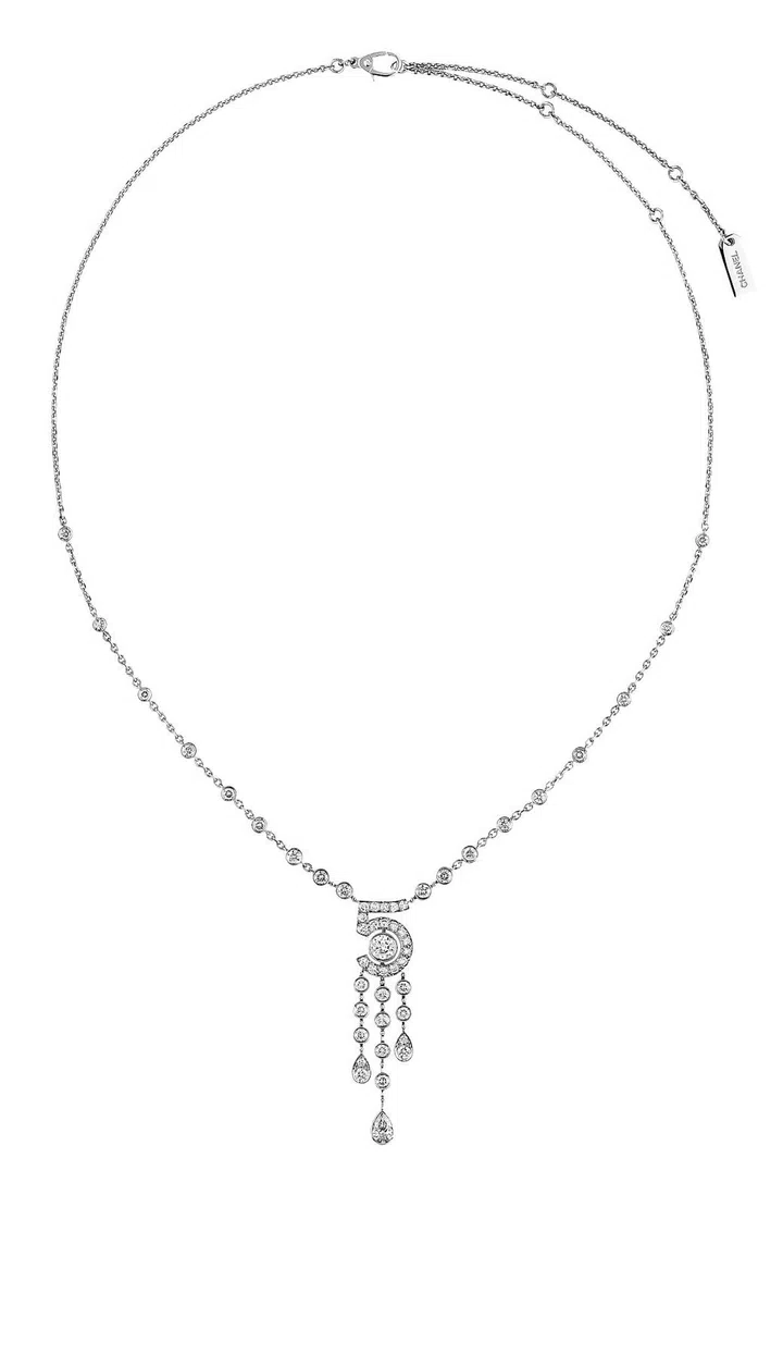 Reportedly the fifth sample of scent that Gabrielle Chanel received from perfumer Ernest Beaux, the Chanel No. 5 perfume celebrates its centennial anniversary with a bold new jewellery collection. Inspired by the beloved scent, the No. 5 fine jewellery range includes designs such as a single drop of perfume and the outline of the signature bottle in a classic combination of diamonds and white gold.