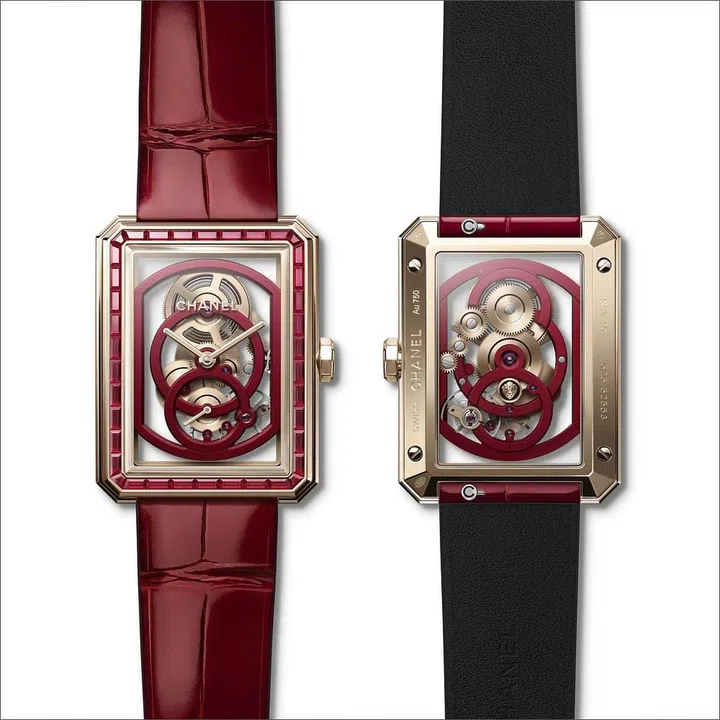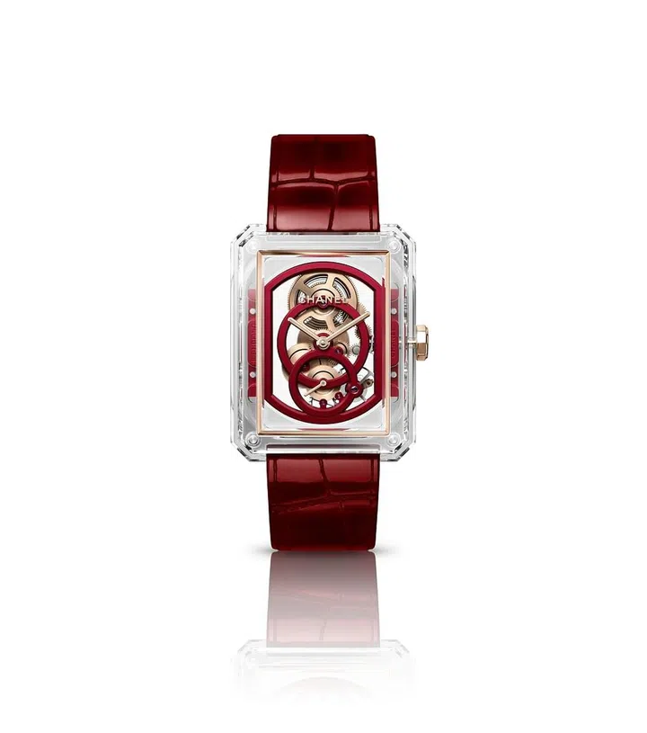 Holding its own against these gemstones, the red coated bridges of Calibre 3 emphasise the movement’s strong, minimalist lines, and contrast handsomely with the gold-toned finish of the wheels. The same movement, which has about 55 hours of power reserve, drives the Boy.Friend Skeleton X-Ray Red Edition. As with other Chanel Haute Horlogerie X-Ray models, the case and bezel here are made from sapphire crystal. This model is completed with a shiny red alligator pattern calfskin strap with a beige gold folding buckle, and is limited to 100 pieces.