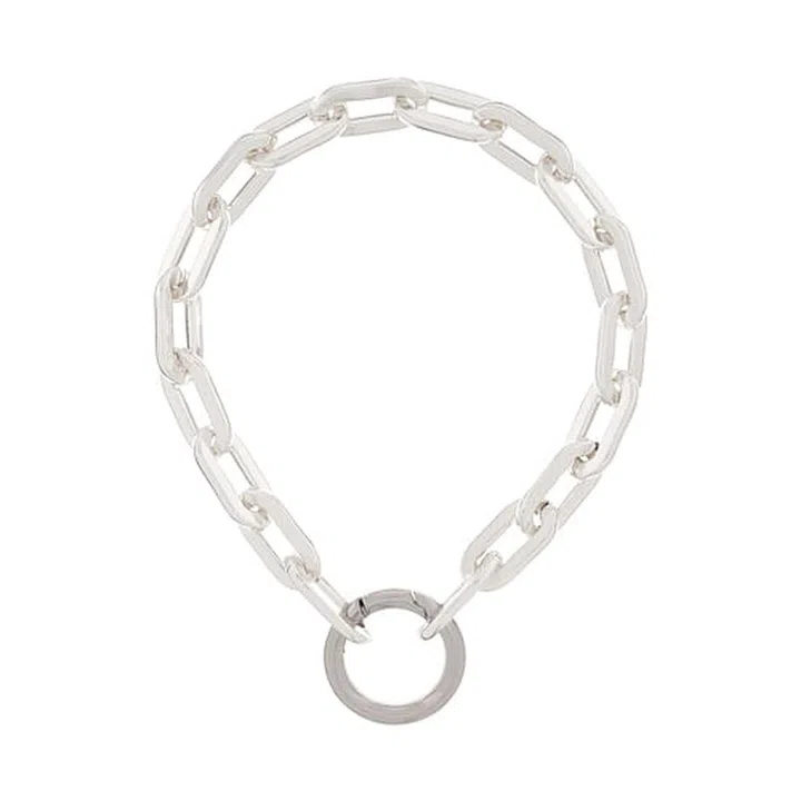 Capturing the toughness of femininity in its SS ‘20 collection, this chunky necklace from Marques’ Almeida is plated with silver and opens via a push clip ring which is also used as a decorative charm.