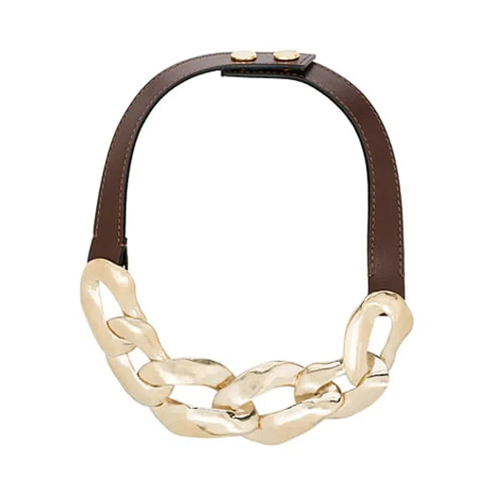 Featuring large gold-plated chain links in slightly abstract shapes, this choker embraces Marni’s penchant for eclecticity by offering a juxtaposing twist in the form of a tan leather back accented by contrasting stitching and adjustable gold snap fastenings.