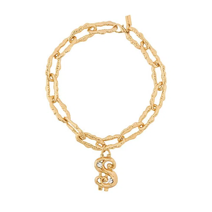Suspended from the rolo chains is a dollar sign motif embellished with diamond-like glass.