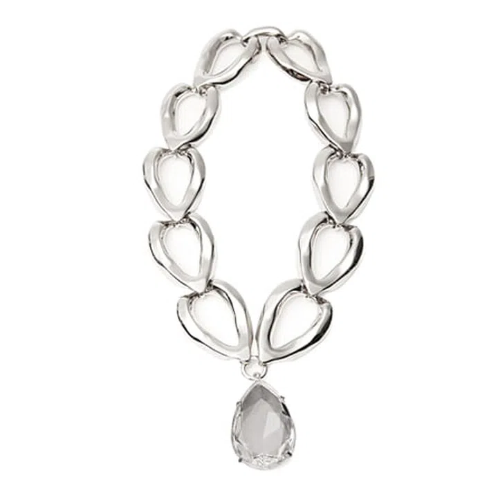 Featuring teardrop-shaped chain links and a translucent crystal drop pendant, this item proves that statement jewellery need not be overly ostentatious in order to look good. Let this glorious number peek out from underneath an unbutton, low neckline suit for a modern and powerful look.