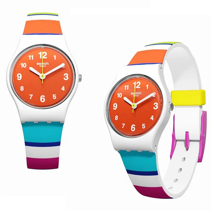 This watch in particular has colourful horizontal stripes on top of a white silicone strap. The dial is a fiery orange shade that contrasts perfectly with the white elements.