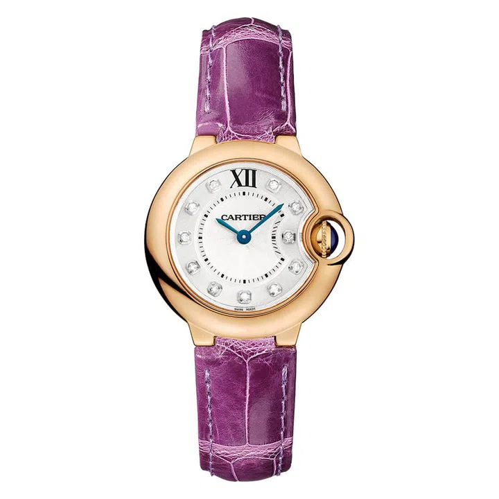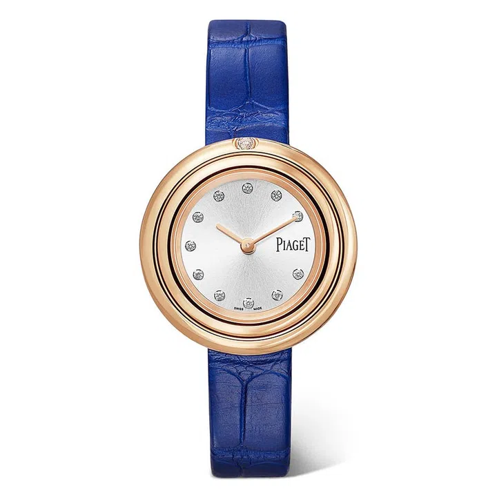 This timepiece comes in a purple alligator skin strap, with navy hands and a sapphire cabochon at the crown to compliment it. Encasing it is a sleek 18k pink gold case.