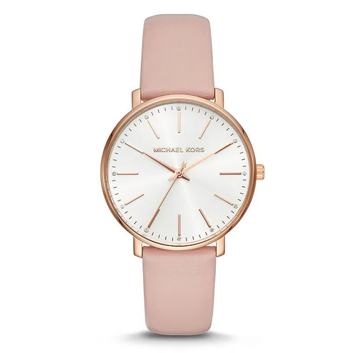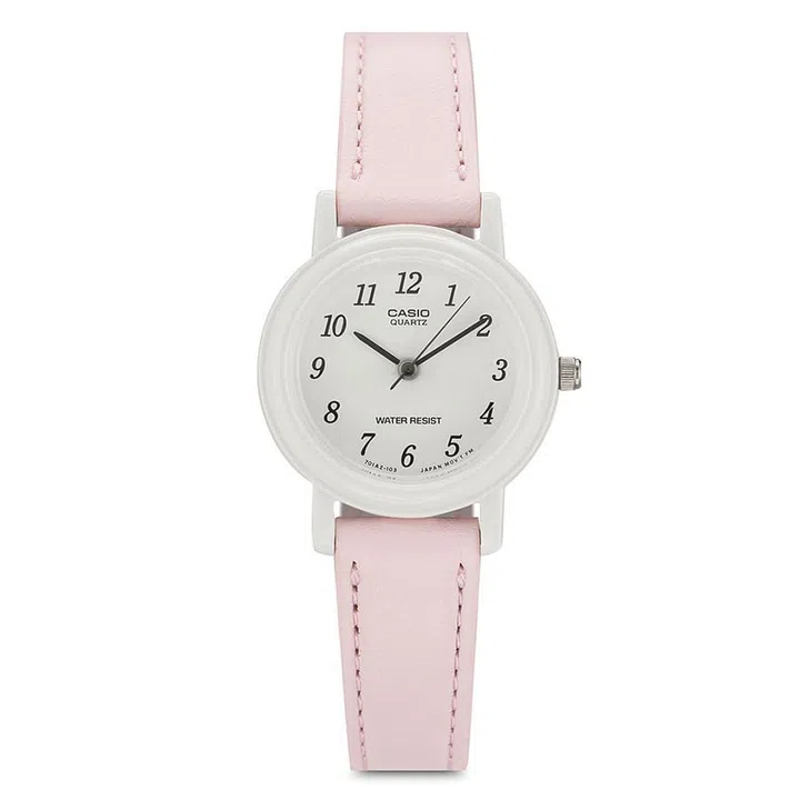 Coming in a versatile pastel pink strap, this watch sports a clean, minimalist feel with sleek numerals at each hour and an eggshell white dial and case.