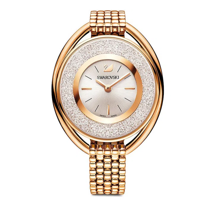 This chic timepiece comes in an oval shape that seems to be a rising trend. With a rose-gold physique and nearly 2000 crystals, who’d say no to this. The crystals will glimmer like a thousand rainbows under the sun.