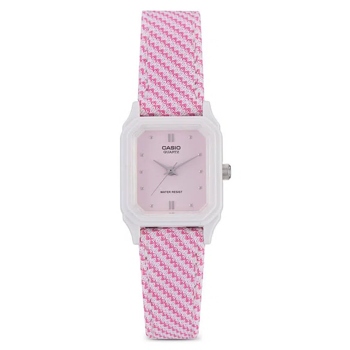 This feminine watch that has a printed leather strap that gives it a little edge. The case and the strap are synthetic, plus the watch is water resistant.