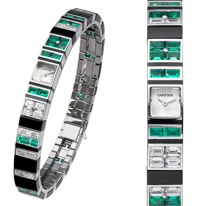 The watch has a rhodium-finish 18k white gold case and bracelet that is bedazzled with 28 baguette-cut diamonds totaling 3.68 carats, 30 baguette-cut emeralds totaling 2.68 carats and 18 onyx totaling 2.64 carats.