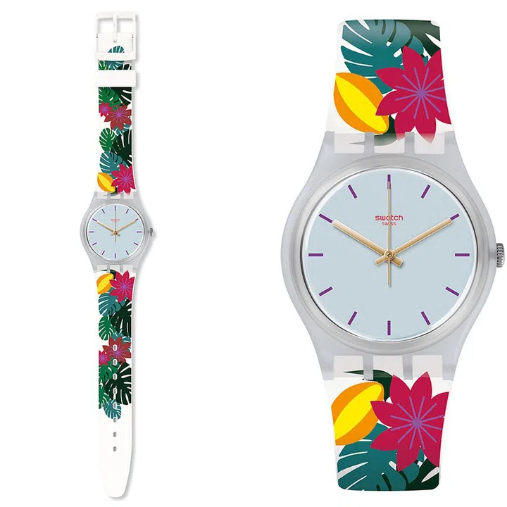 This tropical watch has a white silicone strap that is dressed with vibrant floral prints. To keep things on a minimal, the dial – a simple pastel blue shade – has violet indexes and golden hands.