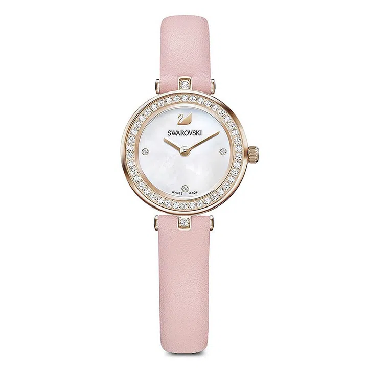 Crystals around the mother-of-pearl dial dazzle and give this watch a feminine appeal. It has a pink, genuine leather bracelet, champagne gold-tone stainless steel case and the iconic Swarovski swan as a final touch.