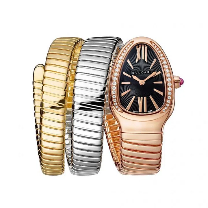 Bulgari reimagines the tri-colour gold trend of ’60s jewellery with this lithesome timepiece that features the Italian house’s signature snake-head case design.