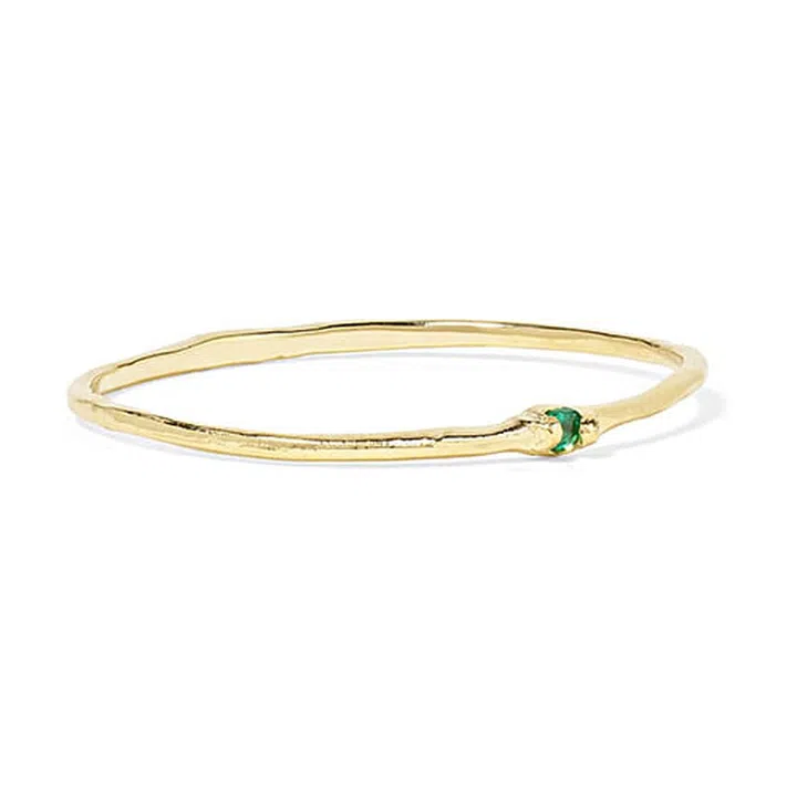 If you love the imperfect beauty of the Japanese wabi-sabi aesthetics, get this gold band from Grace Lee. Hammered from 14-karat gold, the uneven edges of the ring is offset by the glimmering 0.01 carat emerald. This creation would look chic alongside an off-shoulder forest green dress and ankle boots.