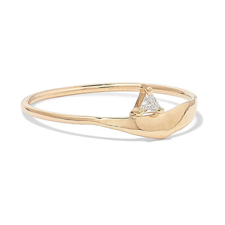 Said to emulate the shape of fragmented petals, this abstract-shaped ring from Sarah & Sebastian comes adorned with a 0.0235-carat trillion-cut diamond that’s unevenly set to play up the rugged and raw feel of the piece. It’s unique and also perfect for someone who likes a dainty piece that comes with a little bling.