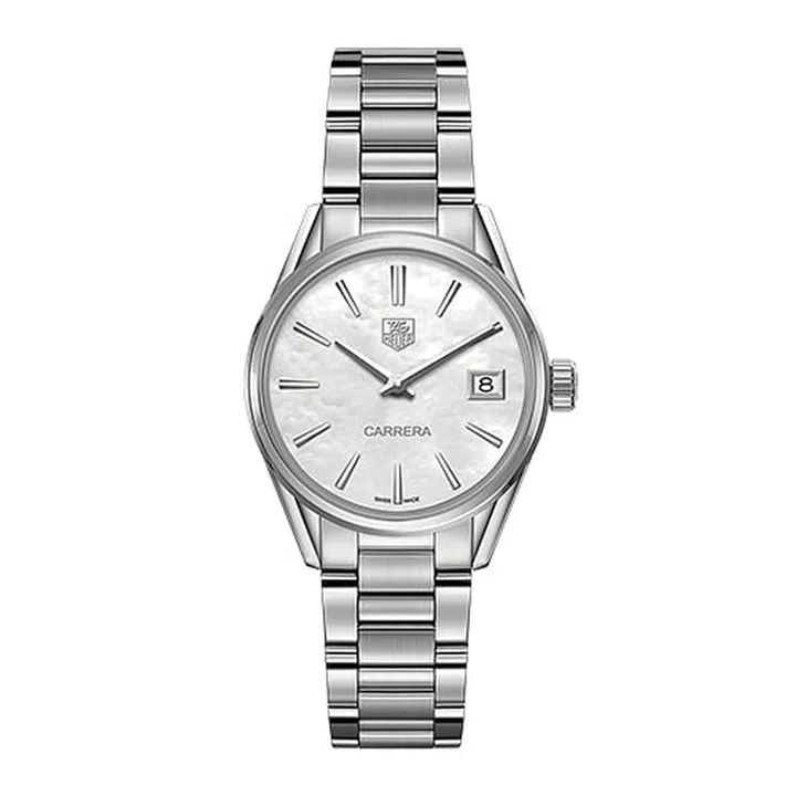 The TAG Heuer Carrera Quartz — which is finished with a white mother of pearl dial with rhodium plated indexes, as well as a polished steel strap and body case — is an understated accessory that exudes sophistication.
