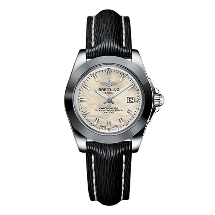 Featuring a steel casing, a leather strap and a mother of pearl dial, this Galactic 32 Sleek Edition from Breitling runs on a trademarked SuperQuartz™ movement (which is a thermocompensated quartz electronic that's 10 times more precise than your standard quartz) — definitely a must-have for those who're interested in both watches and sports.