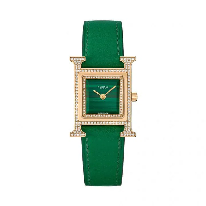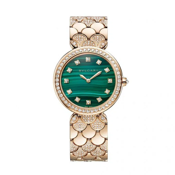 The newest iteration features a malachite dial that’s bevelled, creating a jewel-like effect.