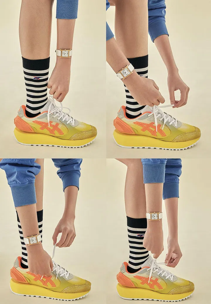 Heure H yellow gold-plated steel watch, Hermes. Sweatshirt, Kenzo. Sneakers and socks, Onitsuka Tiger