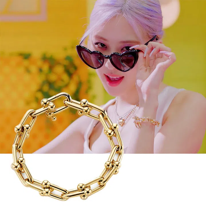 When Rosé took off her Saint Laurent heart-shaped sunglasses, we spotted a cool Tiffany & Co. bracelet from their HardWear collection on her wrist.