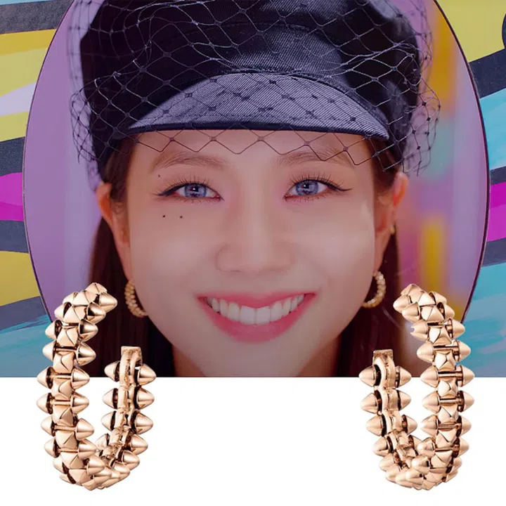 At the start of the music video, Jisoo was seen wearing a chic veiled Dior Arty Cap and a pair of Cartier Clash de Cartier hoop earrings. The studded and spiky earrings add some edge to her sweet look.