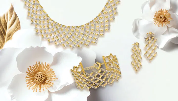 Stepping out for a gala event or just a night on the town? Add a dash of pizzazz to your look with stunning gold lattice detailing. Worn with a white evening gown or monochromatic tube dress, these enchantingly alluring and intricate designs will bring out your radiance and accentuate your neckline. From $1,575.