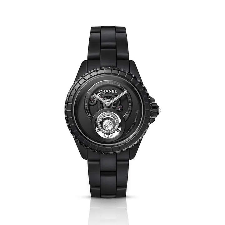 While Chanel’s beloved icon has been graced with tourbillons in the past (2010’s Rétrograde Mystérieuse and the Skeleton Flying Tourbillon of 2015 come to mind), this year’s J12 Diamond Tourbillon stands out for being equipped with the House’s first in-house Flying Tourbillon movement, the Calibre 5. Turn the 38mm manual-wind watch around and you’ll see the emblem that denotes this: The lion head that marks all Chanel’s in-house movements sits serenely at the nine o’clock position. The beautiful architecture of the exposed movement at the back is well matched with a captivating face at the front: The spinning 65 faceted-cut solitaire diamond found in the centre of the flying tourbillon cage will truly fascinate with its ever-twinkling lights. Two versions are available: Matt black ceramic, and a glossy black ceramic with a baguette-cut diamond bezel. Both are of a limited edition of just 55 pieces for women who refuse to settle for anything less.