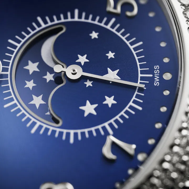 There are few brands that can get you as many nods of approval as having a Patek Philippe strapped to your wrist. Likewise, there are arguably few complications that women gravitate to as much as they do a romantic moon-phase indicator. Enter Patek’s revamped Calatrava Moonphase for ladies. Equipped with the manual-wind Caliber 215 PS LU (the brand’s smallest complicated movement) as with its 2013 precursors, this 33mm timepiece now comes in white gold and a sunburst blue dial encircled with a double row of 132 diamonds. Gold applied Breguet numerals and spade watch hands complete the picture with elegance and polish for a watch that will have you gladly checking the time through the day.