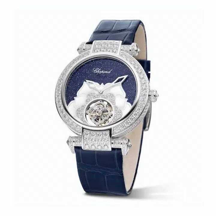 It may have taken Chopard 28 years to introduce a flying tourbillon to its Imperiale collection, but a glance is all it takes to convince that the wait is worth it. A delicate mother-of-pearl marquetry lotus blossom sits beneath a twinkling aventurine night sky. In the midst of its lush, unfurled petals lies a flying tourbillon, courtesy of Chopard’s in-house L.U.C Calibre 96.24-C self-winding movement. It’s a remarkable piece of technology that Chopard first introduced in 2019 and here, the slender movement is put into good use: 194 components have been compressed into a space no bigger than 27.4 by 3.30mm, making it a perfect fit for its 36mm ethical white gold case. Furthermore, the movement is Chronometer-certified and bears the Poinçon de Genève quality hallmark for the utmost sophistication that’s limited to just eight pieces.
