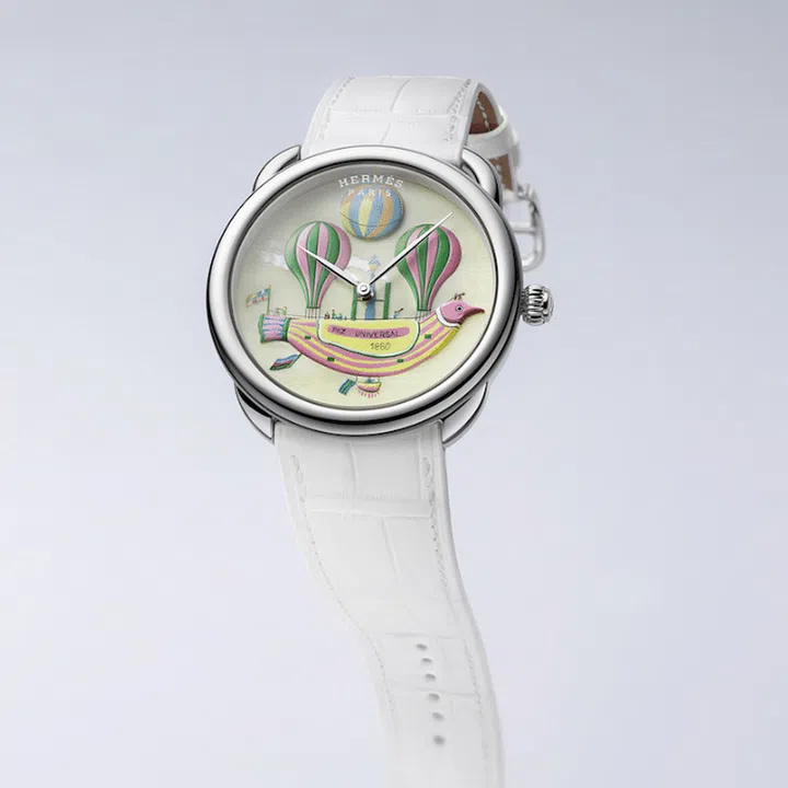 To set the scene for its dial designs, Hermès is not above dipping into its impressively rich archive of scarf designs. But what the House does to reinterpret said scarf design never disappoints. This year, it’s Loïc Dubigeon’s “Les Folies du Ciel” scarf motif of 1984 that has its turn in the spotlight for a 24-piece limited edition collection. And what a delight it is. (Not that we’d expect anything less; no one takes the concept of play as seriously as Hermès, after all.) Engraving and miniature-painted applique bring to live a three dimensional scene that pays homage to the early days of air travel on a mother-of-pearl dial. And at 12 o’clock: An animated balloon that spins on its axis with the wrist’s slightest move to finish the pastel vision with whimsical finesse.