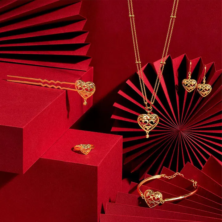 At Poh Heng, you'll be wowed at the auspicious symbols of Chinese traditions preserved tastefully in their new Si Dian Jin range, featuring Dragon Phoenix, Double Happiness Heart, and Mandarin Ducks.