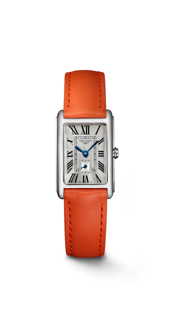 1. Longines DolceVita Roman numerals stainless steel watch with orange leather strap