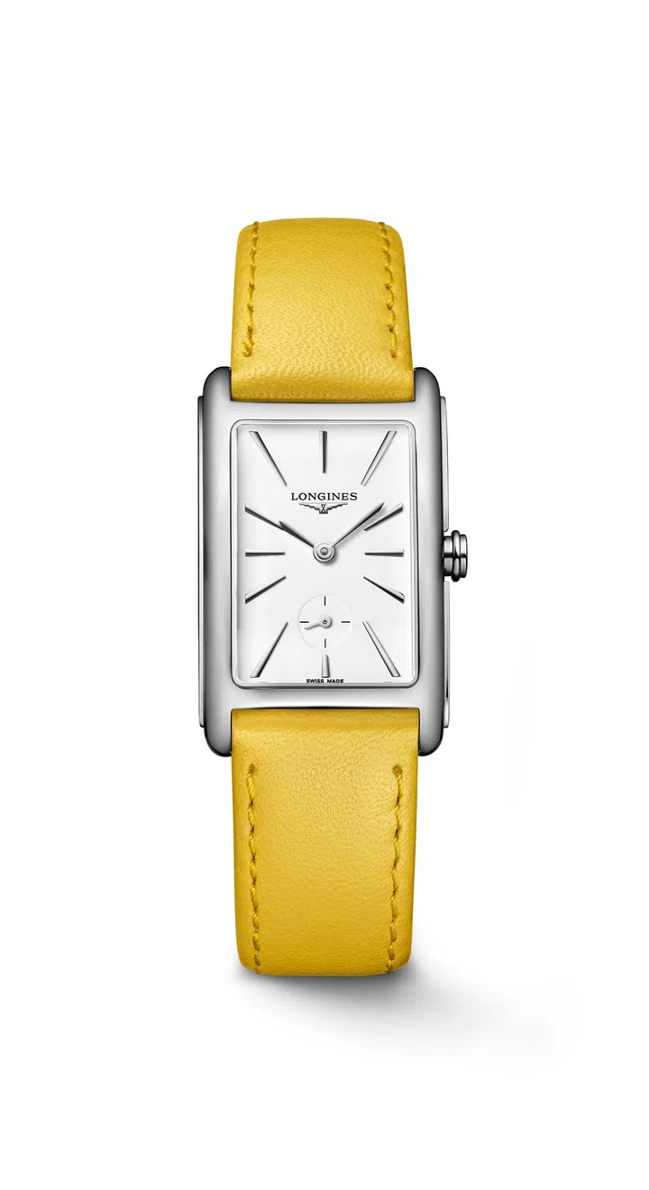 2. Longines DolceVita white applied indices stainless steel watch with yellow leather strap