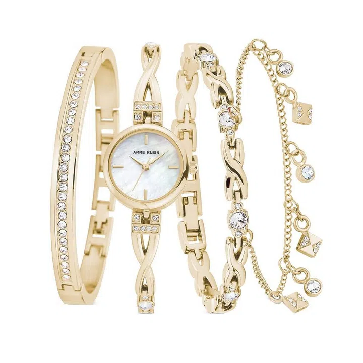 The Anne Klein bangle watch and bracelet box set is the perfect splurge for yourself, or even for your loved ones if you’re feeling generous. The set which has a gold theme comes with a Ggold-tone X bangle bracelet, a gold-tone bangle with Swarovski crystal accents, one charm bracelet and a watch that boasts a white genuine mother-of-pearl dial with gold-tone markers. The watch also features Swarovski crystal accents on it.